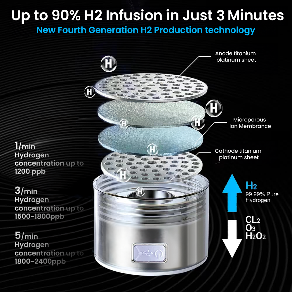 The HydroClear Bottle features two customizable settings for creating hydrogen-rich water tailored to your preferences. Opt for a quick, 3-minute cycle to achieve a hydrogen concentration of 1300ppb, perfect for when you're on the go.